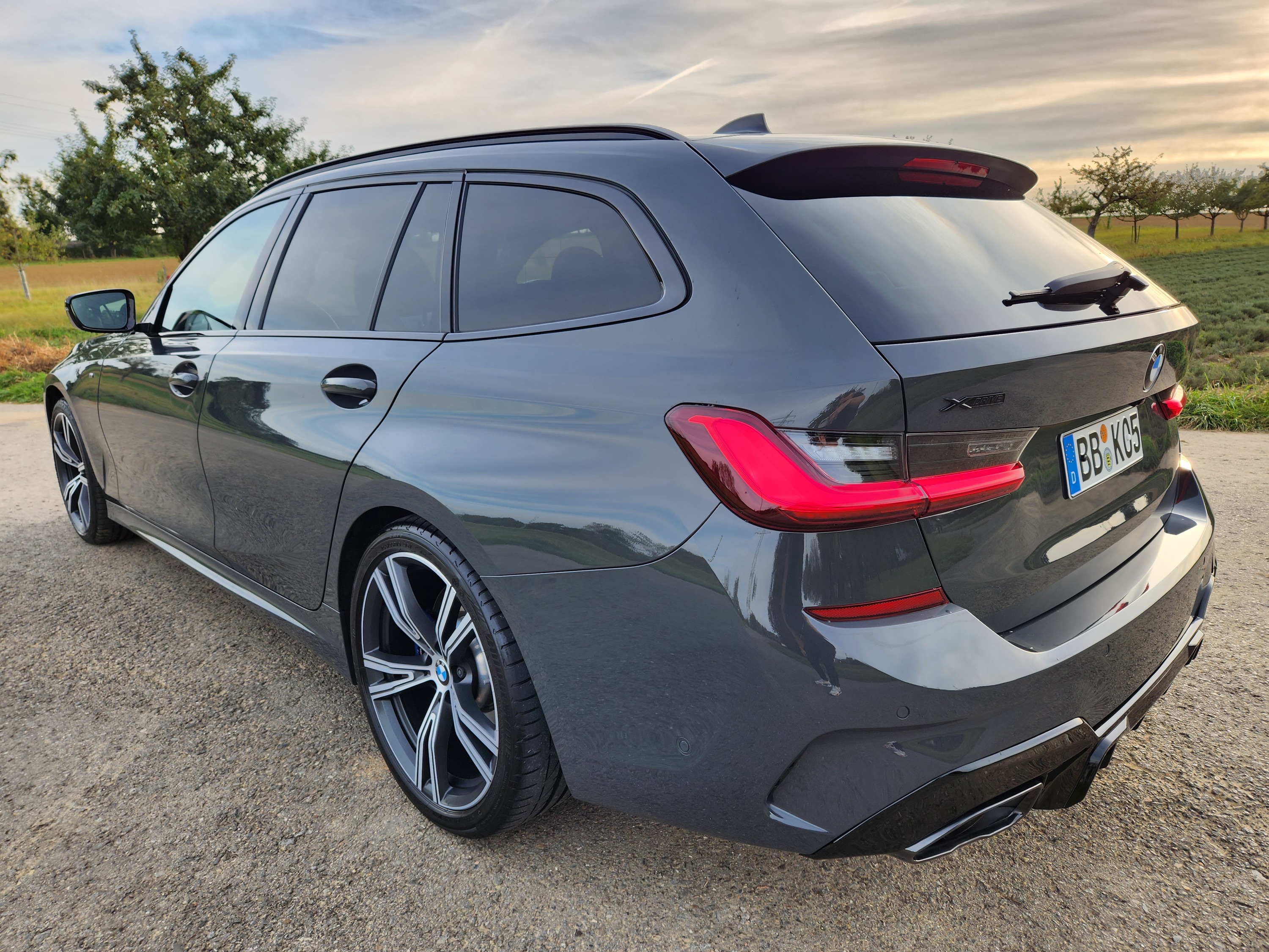 Mein BMW 330xd in Dravitgrau mit 19" Doppelspeiche 793i Felgen, nachgerüstetem DM Automobile Diffusor in schwarz hochglanz und beleuchteter Mittelkonsole.